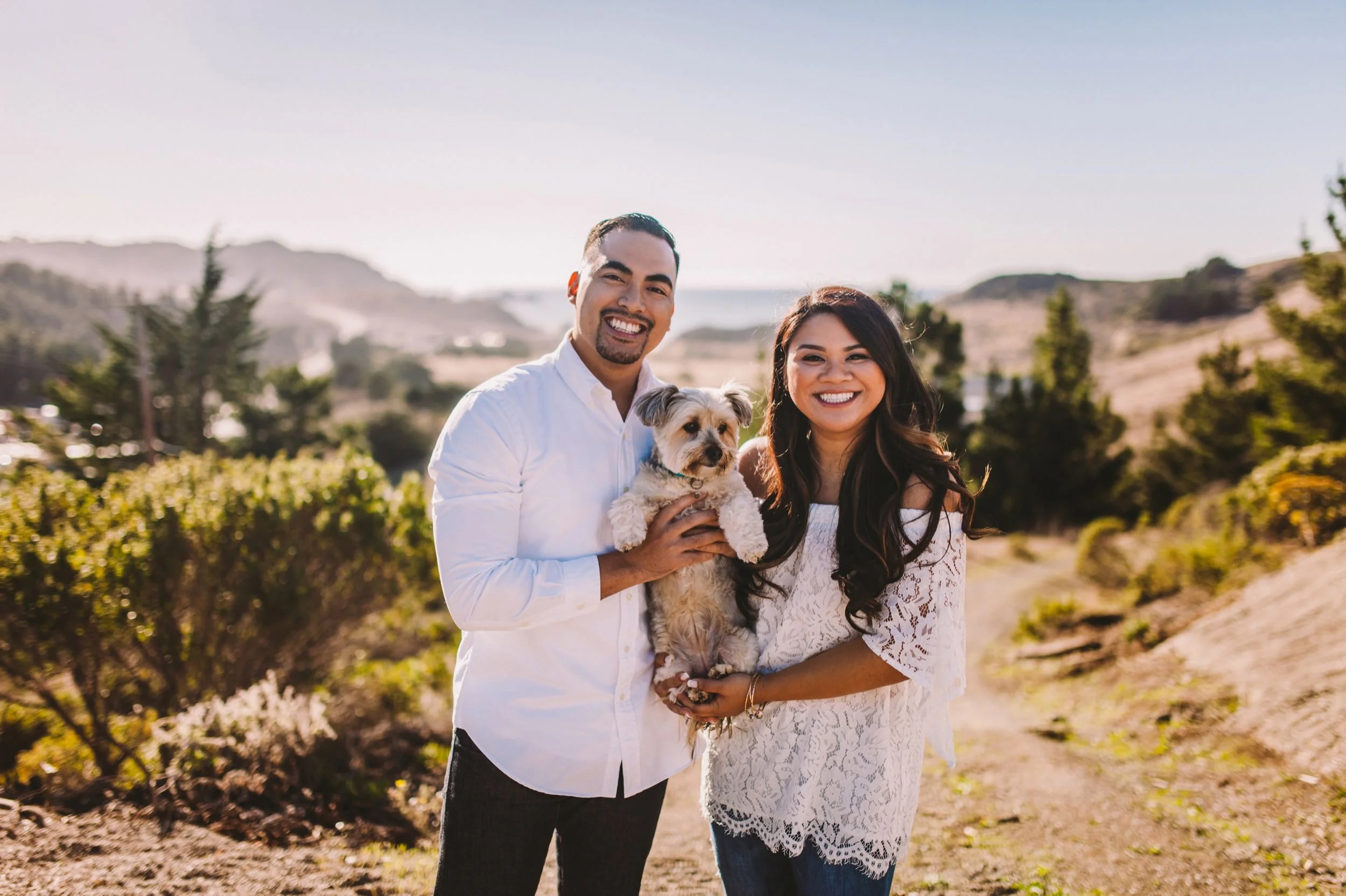 We were so thrilled to return to the gorgeous greenhouses of the Shelldance Orchid Gardens to shoot the awesome Mark & AJ's engagement session! We had such a fun time exploring the gardens together and Mark & AJ even brought their adorable little pup Zola along for the evening. Shelldance looked extra magical as the sun sank out over the Pacific and these guys just seemed to shine with love for each other!